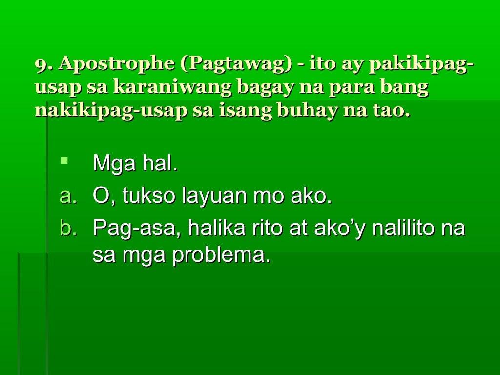 Ang pag-ibig mo ay parang tubig walang lasa. Ang puso mo ay gaya ng bato. PagtawagApostrophe Ito ay pakikipag-usap sa karaniwang bagay na para bang nakikipag- usap sa isang buhay na tao.